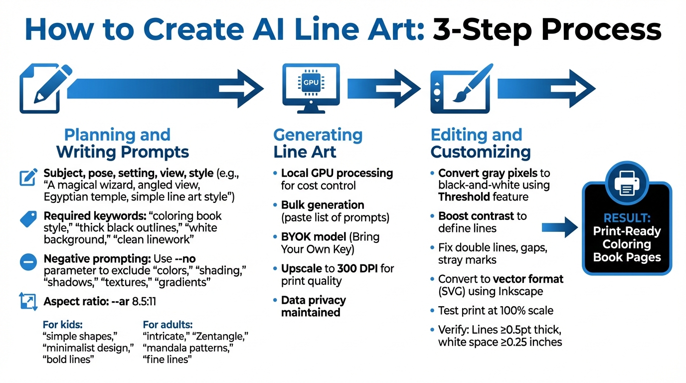 Creating high-quality line art for coloring books involves three key phases: planning your prompts, generating the artwork, and refining the final output. These steps ensure your designs meet print standards and are enjoyable to color. Begin by crafting thoughtful prompts to set the foundation for printable, colorable art.