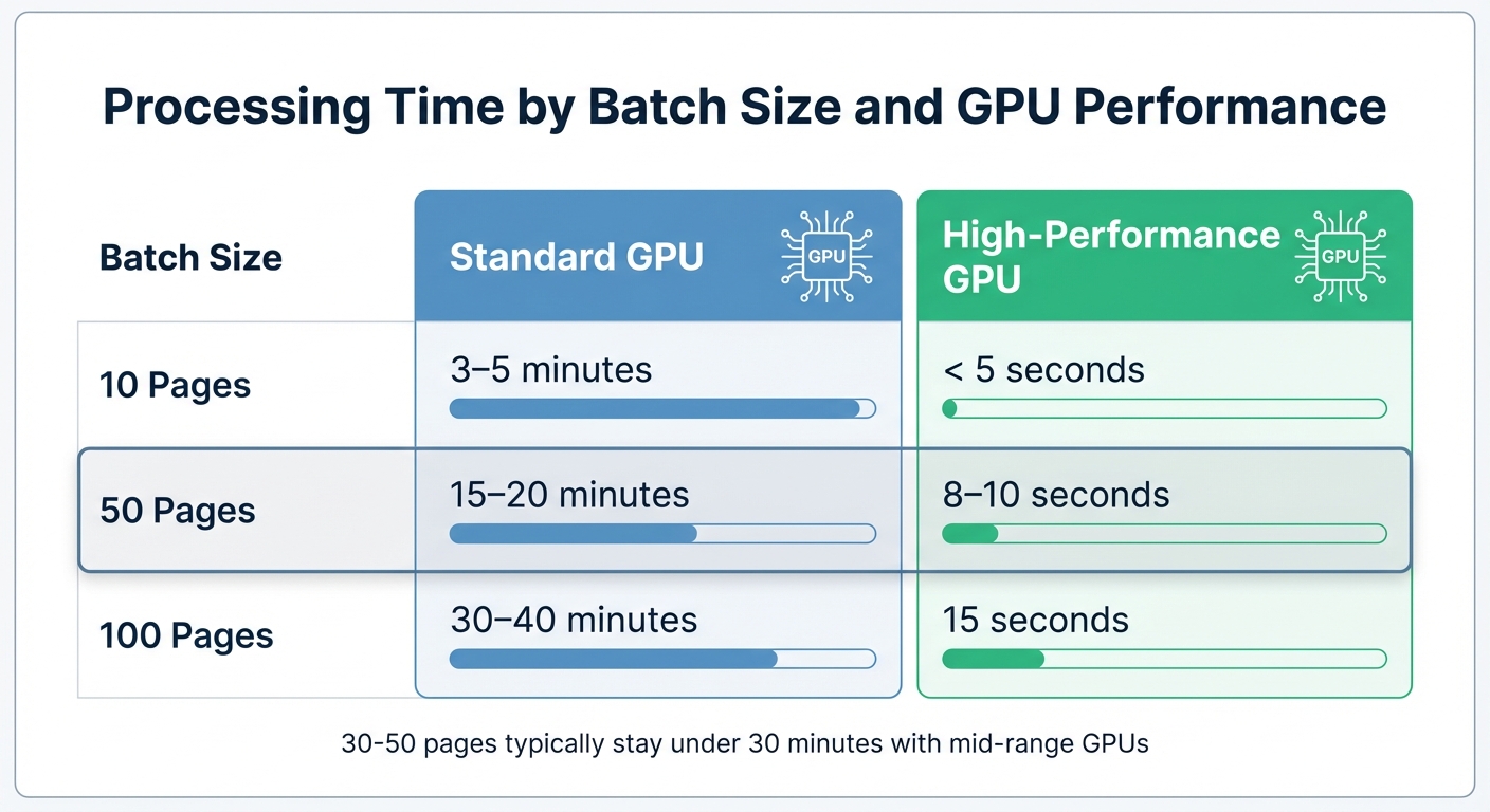 For mid-range GPUs, projects with 30–50 pages usually stay under 30 minutes. If you’re handling larger workloads or producing multiple books daily, the time saved through parallel processing can add up quickly.