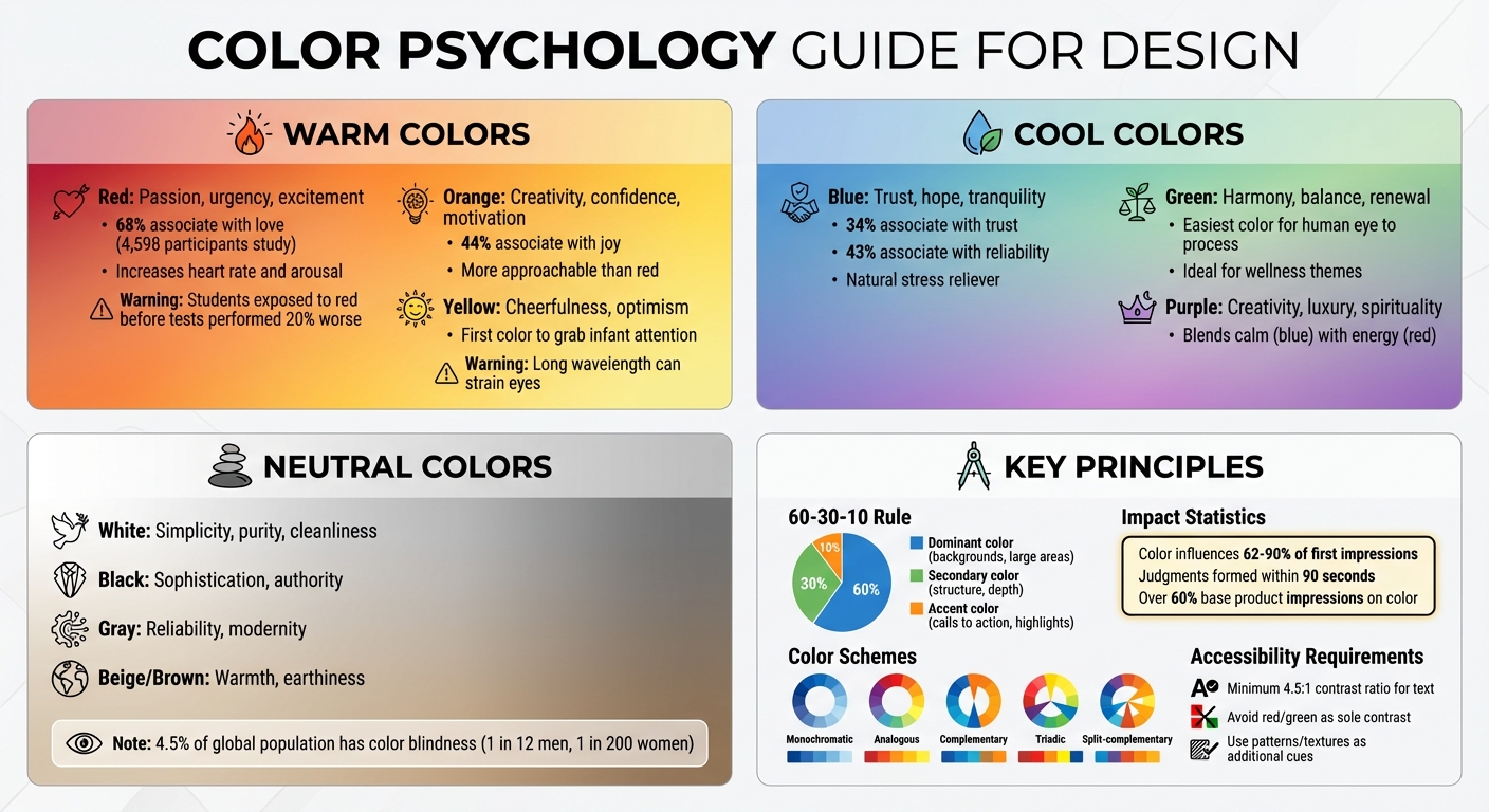 By understanding how colors influence emotions and actions, you can craft palettes that align with your design objectives - or, if used carelessly, work against them. Let’s dive into how warm colors energize and influence behavior.